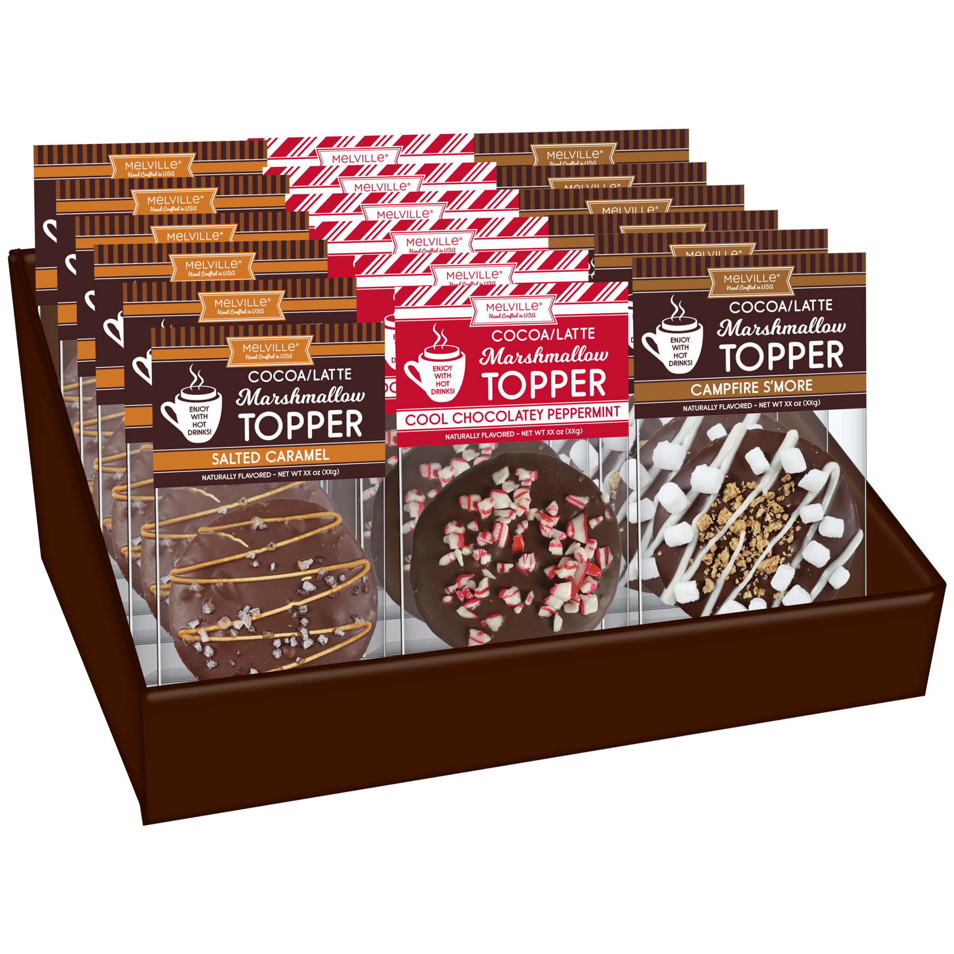 Our Chocolatey-Dipped Marshmallow Toppers come in an assortment of Milk Chocolatey S'mores, Salted Caramel, and Dark Chocolatey Peppermint. Each topper is dipped in chocolatey fudge and decorated by hand. These are perfect for elevating your next cup of hot cocoa! Each topper is handmade; slight variations will occur.