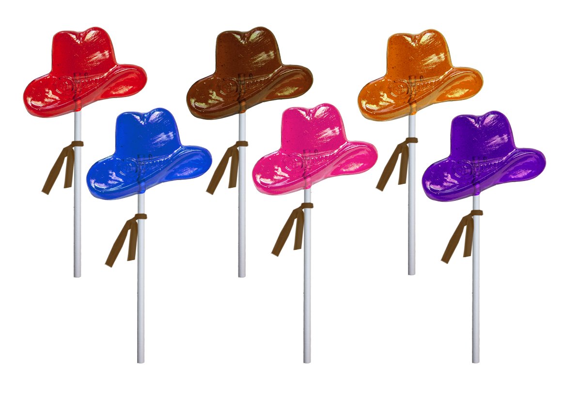 Our Western Cowboy Hat Lollipops come in red cherry, blue raspberry, pink watermelon, orange, green apple, purple grape, yellow banana, brown root beer or an assortment of all eight colors. Each lollipop is hand-poured; slight variations will occur.