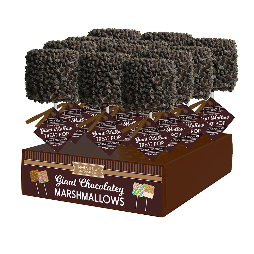 Our Giant Double Chocolate Marshmallow Pops come dipped in dark chocolatey fudge and coated with mini chocolate chips. Each giant marshmallow is hand-dipped and hand-decorated; slight variations will occur.