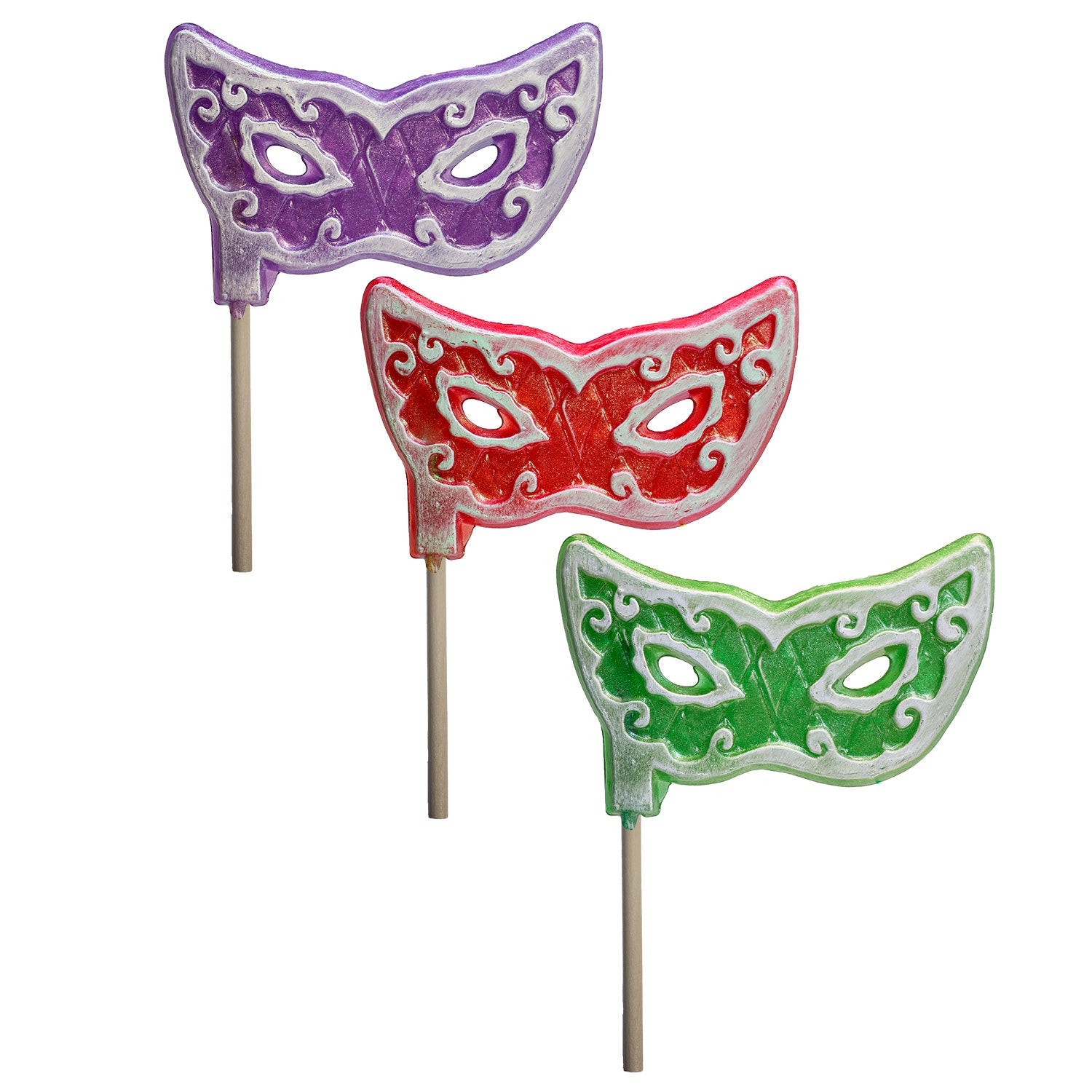 Our Giant Glitter Masquerade Masks are perfect for every event, from photo booths to masquerade balls. Use as an actual hand-held mask or enjoy as a snack. These giant 4.5oz hard candy lollipops are embedded with edible glitter and come in red cherry, purple grape, and green apple flavors. All lollipops are hand-poured; slight variations will occur.