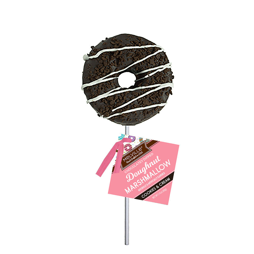 This treat is a donut-shaped marshmallow pop dipped in chocolatey fudge, coated in a cookies and cream topping, then drizzled in chocolatey fudge. So. Much. Yum.