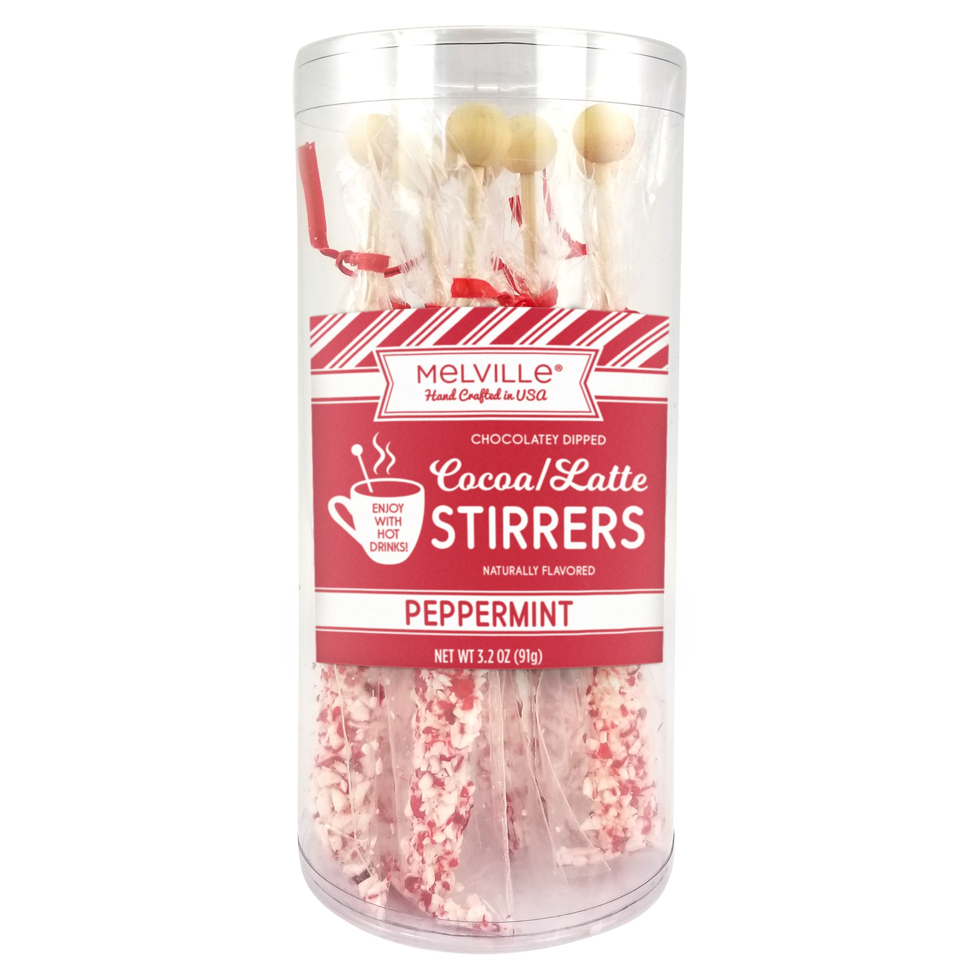 Our White Chocolatey Coated Peppermint Stirrers will turn your hot beverages into an extra special treat. These white chocolatey stirrers are coated in crushed peppermint on wooden ball sticks. To use, simply place in your drink, stir and enjoy! Each stirrer is hand-crafted; slight variations will occur.